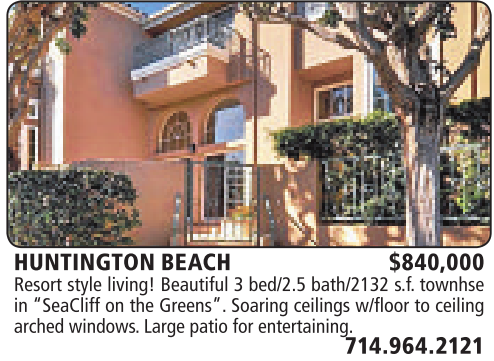 HUNTINGTON BEACH $840,000 Resort style living! Beautiful 3bed/2.5 bath/2132 s.f. townhse in “SeaCliff on the Greens”. Soaring ceilings w/floor to ceiling arched windows. Large patio for entertaining.