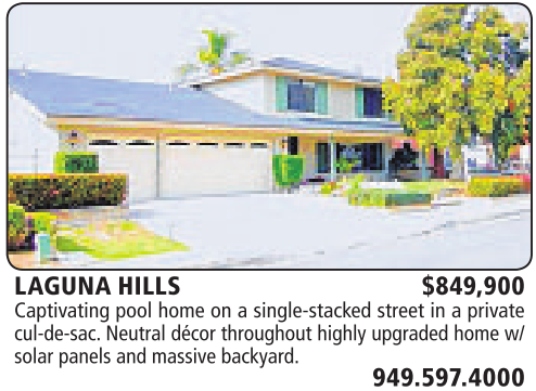 LAGUNA HILLS $849,900 Captivating pool home on asingle-stacked street in aprivate cul-de-sac. Neutral décor throughout highly upgraded home w/ solar panels and massive backyard.