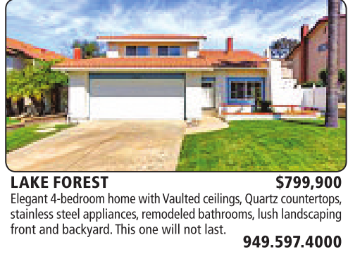 LAKE FOREST $799,900 Elegant 4-bedroom home with Vaulted ceilings,Quartz countertops, stainless steel appliances,remodeled bathrooms, lush landscaping front and backyard.Thisone will not last.