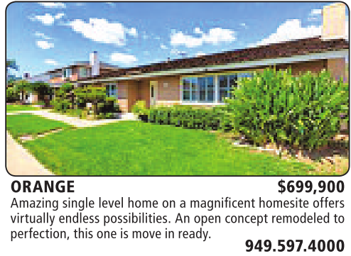 ORANGE $699,900 Amazing single level home onamagnificent homesite offers virtually endless possibilities. An open concept remodeled to perfection,this oneismove in ready. 949.597.4000