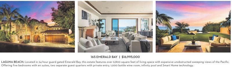 165 EMERALD BAY | $16,995,000 LAGUNA BEACH: Located in 24 hour guard gated Emerald Bay, this estate features over 6,800 square feet of living space with expansive unobstructed sweeping views of the Pacific. Offering five bedrooms with en suites, two separate guest quarters with private entry, 1,000 bottle wine room, infinity pool and Smart Home technology.