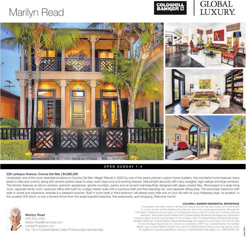 Marilyn Read O P E N S U N D AY 1 - 4 228 Larkspur Avenue, Corona Del Mar | $4,995,000 Undeniably one of the most desirable locations in Corona Del Mar Village! Rebuilt in 2003 by one of the area’s premier custom home builders, this wonderful home features many areas to relax and unwind, along with several outdoor areas to enjoy warm days and cool evening breezes. Natural light abounds with many skylights, high ceilings and large windows. The kitchen features an atrium window, premium appliances, granite counters, pantry and an accent wall beautifully designed with glass colored tiles. Showcased is a large living room, separate family room, spacious office with built ins, a large master suite with a luxurious bath and free standing tub, and separate sitting area. The secondary bedroom with walk in closet and expansive veranda is a pleasant surprise. Built in bunk beds in third bedroom will please every little one on your list with its cozy hideaway style. Its location, in the coveted 200 block, is only a stone’s throw from the areas beautiful beaches, fine restaurants, and shopping. Welcome home! Marilyn Read 949.632.2494 Marilyn.Read@camoves.com LidoIsleProperties.com Top 1% of Coldwell Banker Sales Professionals Internationally COLDWELL BANKER RESIDENTIAL BROKERAGE The property information herein is derived from various sources that may include, but not be limited to, county records and the Multiple Listing Service, and it may include approximations. Although the information is believed to be accurate, it is not warranted and you should not rely upon it without personal verification. Real estate agents affiliated with Coldwell Banker Residential Brokerage are independent contractor agents and are not employees of the Company. ©2018 Coldwell Banker Residential Brokerage. All Rights Reserved. Coldwell Banker Residential Brokerage fully supports the principles of the Fair Housing Act and the Equal Opportunity Act. Owned by asubsidiary ofNRT LLC. Coldwell Banker, the Coldwell Banker Logo, Coldwell Banker Global Luxury and the Coldwell Banker Global Luxury logo service marks are registered or pending registrations owned by Coldwell Banker Real Estate LLC. CalRE#00981786