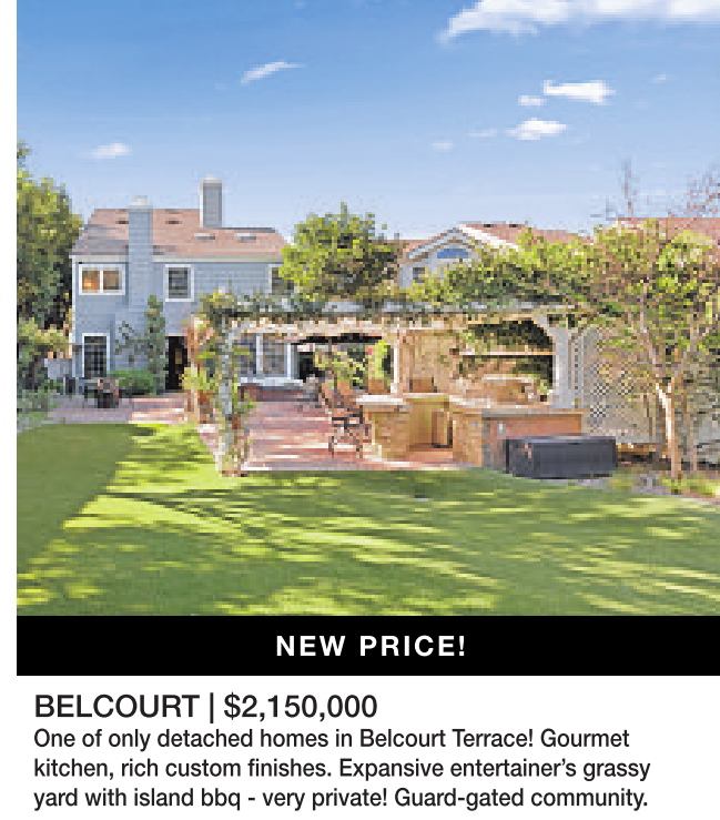 BELCOURT | $2,150,000 One of only detached homes in Belcourt Terrace! Gourmet kitchen, rich custom finishes. Expansive entertainer’s grassy yard with island bbq - very private! Guard-gated community.