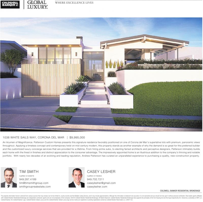 WHERE EXCELLENCE LIVES 1038 WHITE SAILS WAY, CORONA DEL MAR | $9,995,000 An Acumen of Magnificence. Patterson Custom Homes presents this signature residence favorably positioned on one of Corona del Mar’s superlative lots with premium, panoramic views throughout. Applying a timeless concept and contemporary twist on mid-century modern, this property stands as another example of why the demand is so great for this preferred builder and the customized luxury concierge services that are provided for a lifetime. From hiring prime subs, to electing famed architects and perceptive designers, Patterson intimately builds each home with the finest in finishes and distinct appreciation to the consumer advantage. The impressively appointed home is an illustrious addition to the company’s thriving and notable portfolio. With nearly two decades of an evolving and leading reputation, Andrew Patterson has curated an unparalleled experience to purchasing a quality, new-construction property. TIM SMITH CalRE# 01346878 949.287.4189 tim@timsmithgroup.com smithgrouprealestate.com CASEY LESHER CalRE# 01795953 949.702.7211 caseylesher@gmail.com caseylesher.com COLDWELL BANKER RESIDENTIAL BROKERAGE The property information herein is derived from various sources that may include, but not be limited to, county records and the Multiple Listing Service, and it may includeapproximations. Althoughthe information is believed to be accurate, it is not warranted and you should not rely upon it without personal verification. Real estate agents affiliated with Coldwell Banker Residential Brokerage are independent contractor agents and are not employees of the Company.©2018 Coldwell Banker Residential Brokerage. All Rights Reserved. Coldwell Banker Residential Brokerage fully supports the principles of the Fair Housing Act and the Equal Opportunity Act. Owned by asubsidiaryofNRT LLC. Coldwell Banker,the Coldwell Banker Logo, Coldwell Banker Global Luxuryand the Coldwell Banker Global Luxurylogoservice marksare registered or pending registrations owned by Coldwell Banker Real Estate LLC. (9497112)