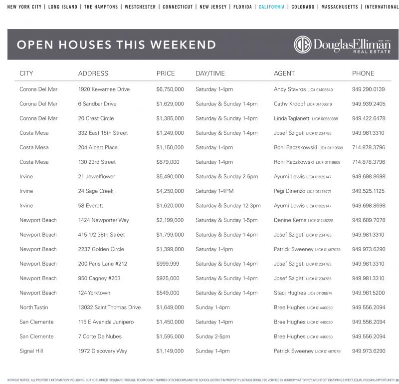 Corona Del Mar 1920 Kewamee Drive $6,750,000 Saturday 1-4pm Andy Stavros LIC# 01408840 949.290.0139 Corona Del Mar 6 Sandbar Drive $1,629,000 Saturday & Sunday 1-4pm Cathy Kroopf LIC# 01406619 949.939.2405 Corona Del Mar 20 Crest Circle $1,385,000 Saturday & Sunday 1-4pm Linda Taglanetti LIC# 00580388 949.422.6478 Costa Mesa 332 East 15th Street $1,249,000 Saturday & Sunday 1-4pm Josef Szigeti LIC# 01234785 949.981.3310 Costa Mesa 204 Albert Place $1,150,000 Saturday 1-4pm Roni Raczskowski LIC# 01119609 714.878.3796 Costa Mesa 130 23rd Street $879,000 Saturday 1-4pm Roni Raczkowski LIC# 01119609 714.878.3796