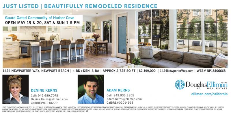 JUST LISTED | BEAUTIFULLY REMODELED RESIDENCE Guard Gated Community of Harbor Cove OPEN MAY 19 & 20, SAT & SUN 1-5 PM 1424 NEWPORTER WAY, NEWPORT BEACH | 4-BD+DEN 3-BA | APPROX 2,725 SQ FT | $2,199,000 | 1424NewporterWay.com | WEB# NP18106668 DENINE KERNS Cell: 949.689.7078 Denine.Kerns@elliman.com CalBRE#01248229 ADAM KERNS Cell: 949.933.3855 Adam.Kerns@elliman.com CalBRE#02014968 elliman.com/california 150 EL CAMINO DRIVE,BEVERLYHILLS,CA90212.310.595.3888 ©2018 DOUGLAS ELLIMAN REAL ESTATE. ALL MATERIAL PRESENTED HEREIN IS INTENDED FOR INFORMATION PURPOSES ONLY. WHILE,THIS INFORMATION IS BELIEVED TO BE CORRECT,ITISREPRESENTED SUBJECT TO ERRORS,OMISSIONS,CHANGES OR WITHDRAWALWITHOUT NOTICE.ALL PROPERTY INFORMATION, INCLUDING,BUT NOTLIMITED TO SQUARE FOOTAGE,ROOM COUNT,NUMBER OF BEDROOMS AND THE SCHOOL DISTRICT IN PROPERTY LISTINGS SHOULD BE VERIFIED BY YOUR OWN ATTORNEY,ARCHITECT OR ZONINGEXPERT. IF YOUR PROPERTY IS CURRENTLYLISTED WITH ANOTHERREAL ESTATE BROKER,PLEASE DISREGARD THIS OFFER.ITISNOT OUR INTENTIONTOSOLICIT THE OFFERINGS OF OTHERREALESTATEBROKERS.WECOOPERATE WITH THEM FULLY. EQUAL HOUSINGOPPORTUNITY.