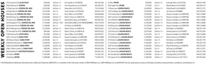 35 Ohio, IRVINE $939,000 Sat/Sun 1-4 EustorgioVilla, Lic #01377262 949.632.1698 5092 Apple Tree, IRVINE $710,000 Sat 1-4 Marsha Marks, Lic #01750263 949.294.4123 19 Alexa Lane, LADERARANCH $2,650,000 Sat/Sun 1-4 Shiba Mostofi, Lic #01960418 949.973.7575 1539 Caribbean Wy, LAGUNA BEACH $4,249,000 Sun 1-4 Jim Doria, Lic #01000980 949.793.2087 134Crescent BayDr, LAGUNA BEACH $3,599,000 Sun 1-4 Shauna Covington, Lic #00991380 949.412.8088 2097 Crestview Dr, LAGUNA BEACH $3,295,000 Sat/Sun 1-4 Shauna Covington, Lic #00991380 949.412.8088 31572Bluff Dr, LAGUNA BEACH $2,995,000 Sat/Sun 1-4 Shauna Covington, Lic #00991380 949.412.8088 960 TempleTerr, LAGUNA BEACH $2,790,000 Sat/Sun 1-4 Shauna Covington, Lic #00991380 949.412.8088 616BolsanaDr, LAGUNA BEACH $2,750,000 Sat/Sun 1-4 Shauna Covington, Lic #00991380 949.412.8088 1475 Coral Drive, LAGUNA BEACH $2,475,000 Sun 1-4 Rick Balzer, Lic #00329607 949.230.1799 2729 Victoria Dr, LAGUNA BEACH $2,475,000 Sat/Sun 1-4 Sandee Spencer, Lic #01929977 949.705.7004 372CenterSt, LAGUNA BEACH $2,375,000 Sun 1-4 Shauna Covington, Lic #00991380 949.412.8088 31252Monterey St, LAGUNA BEACH $1,999,990 Sat/Sun 1-4 Diane Cannon, Lic#01090918 949.230.1200 919Oriole Dr, LAGUNA BEACH $1,950,000 Sun 1-4 Rick Balzer, Lic #00329607 949.230.1799 31192Brooks St, LAGUNA BEACH $1,950,000 Sun 1-4 Rick Balzer, Lic #00329607 949.230.1799 2930 TerryRd, LAGUNA BEACH $1,850,000 Sat/Sun 1-4 MichaelMechling, Lic #01858728 949.378.2505 489 Jasmine St, LAGUNA BEACH $1,689,000 Sat 1-4 Jeff Loge, Lic#00796807 949.212.5201 917 Summit Wy, LAGUNA BEACH $1,625,000 Sat/Sun 1-4 Spencer Wall, Lic #01840729 949.375.7768 425 Graceland Dr, LAGUNA BEACH $1,499,000 Sat/Sun 1-4 EustorgioVilla, Lic #01377262 949.632.1698 552 Cypress Dr #2, LAGUNA BEACH $1,085,000 Sat/Sun 1-4 Kristine Torrance, Lic #01175513 949.793.4260
