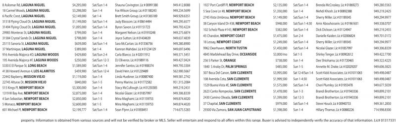 8Asilomar Rd, LAGUNA NIGUEL $4,295,000 Sat/Sun 1-4 Shauna Covington, Lic #00991380 949.412.8088 18 Carmel Woods, LAGUNA NIGUEL $3,298,000 Sun 1-4 FoxWilson Group, Lic #01180243 949.234.5699 6Pacific Crest, LAGUNA NIGUEL $2,149,000 Sat 1-4 Brett Smith Group, Lic #01365189 949.929.6351 31518 Flying Cloud Dr, LAGUNA NIGUEL $1,149,000 Sat/Sun 1-4 Judy Blossom, Lic #00614494 949.295.6577 31494Flying Cloud Dr, LAGUNA NIGUEL $1,095,000 Sat/Sun1-4 Byron Savon, Lic #01151723 949.793.4224 29985 Monteras St, LAGUNA NIGUEL $799,000 Sun 1-4 Margaret Nelson, Lic #01910248 949.275.6874 31584 Crystal Sands Dr, LAGUNA NIGUEL $798,000 Sun 1-4 JoyceSutton, Lic #01434639 949.637.4839 25115 Sanoria St, LAGUNA NIGUEL $639,000 Sat/Sun 1-4 Sara McCartan, Lic #01336756 949.280.8900 37 Martinique, LAGUNA NIGUEL $389,000 Sat 1-4 Kamran Mahdavi, Lic #01234129 949.697.6496 916Avenida Majorca #D, LAGUNA WOODS $429,800 Sat/Sun 2-4 Carla Blanco, Lic #02011912 949.371.5451 195 Avenida Majorca #F, LAGUNA WOODS $250,000 Sat/Sun 12-3 DJ Oliveros, Lic #01989116 949.427.0424 5330 EElParque St, LONG BEACH $1,589,000 Sat/Sun 1-4 Jennifer Santos, Lic #01908374 949.793.3304 4138 HowardAvenue 4, LOSALAMITOS $459,900 Sat/Sun 12-4 David Hein, Lic #01229489 562.900.5667 22442Bayberry, MISSION VIEJO $1,119,000 Sun 1-4 Linda Huebner, Lic #00887400 949.581.2742 22745 Alturas Dr, MISSION VIEJO $840,000 Sun 1-5 PennyMarino, Lic #01772582 951.315.2084 515 Kings Pl, NEWPORT BEACH $3,300,000 Sun 1-4 StacyMcCullough, Lic #01250385 949.219.2431 1319 WBay Ave, NEWPORT BEACH $2,875,000 Sun 1-4 Nicolai Glazer, Lic #01857997 949.306.8339 4San Sebastian, NEWPORT BEACH $2,850,000 Sun 1-5 Mina Maghami, Lic#01159753 949.874.4020 5Monaco, NEWPORT BEACH $2,600,000 Sat 1-5 Mina Maghami, Lic#01159753 949.874.4020 601 MichaelPl, NEWPORT BEACH $2,199,777 Sat/Sun 1-4 Sean Flynn, Lic #01858451 714.675.5283