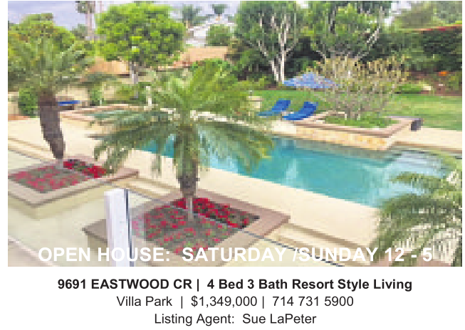 9691 EASTWOOD CR| 4Bed 3Bath Resort Style Living Villa Park | $1,349,000 | 714 731 5900 Listing Agent: Sue LaPeter