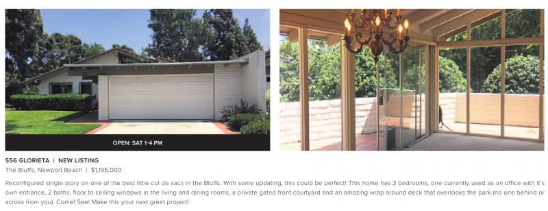 OPEN: SAT 1-4 PM 556 GLORIETA | NEW LISTING The Bluffs, Newport Beach | $1,195,000 Reconfigured single story on one of the best little cul de sacs in the Bluffs. With some updating, this could be perfect! This home has 3 bedrooms, one currently used as an office with it’s own entrance, 2 baths, floor to ceiling windows in the living and dining rooms, a private gated front courtyard and an amazing wrap around deck that overlooks the park (no one behind or across from you). Come! See! Make this your next great project!