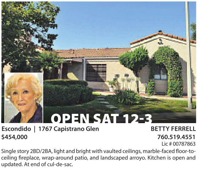 Escondido | 1767 Capistrano Glen BETTYFERRELL $454,000 760.519.4551 Lic #00787863 Single story2BD/2BA, light and bright with vaulted ceilings,marble-faced floor-toceiling fireplace, wrap-around patio, and landscaped arroyo. Kitchen is open and updated.Atend of cul-de-sac. OPEN SAT 12-3