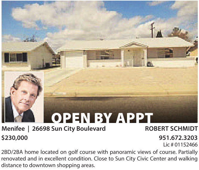 OPEN BY APPT Menifee | 26698 Sun CityBoulevard ROBERT SCHMIDT $230,000 951.672.3203 Lic #01152466 2BD/2BA home located on golf course with panoramic views of course. Partially renovated and in excellent condition. Close toSun City Civic Center and walking distancetodowntownshopping areas. See also