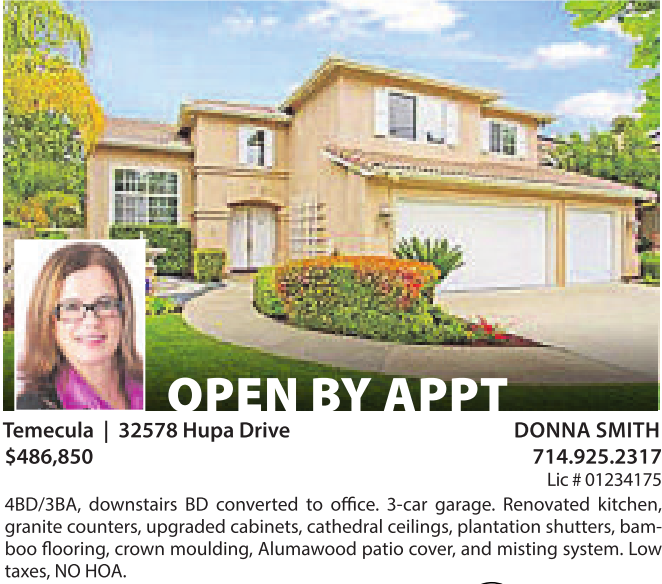 OPEN BY APPT 4BD/3BA, downstairs BD converted to office. 3-car garage. Renovated kitchen, granitecounters, upgraded cabinets,cathedral ceilings,plantation shutters,bamboo flooring,crown moulding,Alumawood patio cover,and misting system. Low taxes,NOHOA. Temecula | 32578 Hupa Drive DONNA SMITH $486,850 714.925.2317 Lic #01234175 See also