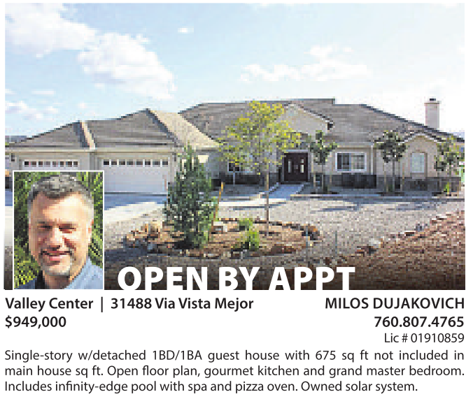 OPEN BY APPT Valley Center | 31488 ViaVista Mejor MILOS DUJAKOVICH $949,000 760.807.4765 Lic #01910859 Single-story w/detached 1BD/1BA guest house with 675 sq ft not included in main house sq ft. Open floor plan, gourmet kitchen and grand master bedroom. Includes infinity-edge pool with spa and pizza oven. Ownedsolar system. See also