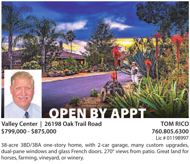 OPEN BY APPT Valley Center | 26198 Oak Trail Road TOMRICO $799,000 -$875,000 760.805.6300 Lic #01198997 38-acre 3BD/3BA one-story home, with 2-car garage, many custom upgrades, dual-pane windows and glass French doors.270° viewsfrompatio.Great land for horses,farming,vineyard, or winery. See also