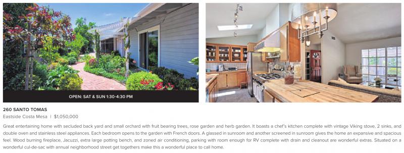 OPEN: SAT &SUN 1:30-4:30 PM 260 SANTO TOMAS Eastside Costa Mesa | $1,050,000 Great entertaining home with secluded back yard and small orchard with fruit bearing trees, rose garden and herb garden. It boasts a chef’s kitchen complete with vintage Viking stove, 2 sinks, and double oven and stainless steel appliances. Each bedroom opens to the garden with French doors. Aglassed in sunroom and another screened in sunroom gives the home an expansive and spacious feel. Wood burning fireplace, Jacuzzi, extra large potting bench, and zoned air conditioning, parking with room enough for RV complete with drain and cleanout are wonderful extras. Situated on a wonderful cul-de-sac with annual neighborhood street get togethers make this a wonderful place to call home.