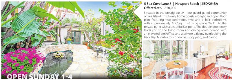 5 Sea Cove Lane 8 | Newport Beach | 2BD/2½BA Offered at $1,350,000 Situated in the prestigious 24 hour guard gated community of Sea Island. This lovely home boasts a bright and open floor plan featuring two bedrooms, two and a half bathrooms with approximately 2272 sq. ft. of living space. Walk into the private patio with a beautiful Koi pond.The double door entry leads you to the living room and dining room combo with an elevated den/office and a private balcony overlooking the Back Bay. Minutes to world-class shopping, and dining. OPEN SUNDAY 1-4