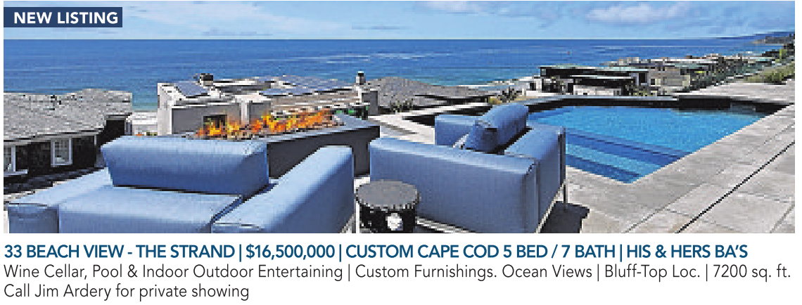 33 BEACHVIEW-THE STRAND |$16,500,000 |CUSTOMCAPECOD 5BED /7BATH|HIS &HERS BA’S Wine Cellar, Pool & Indoor Outdoor Entertaining | Custom Furnishings. Ocean Views | Bluff-Top Loc. | 7200 sq. ft. Call Jim Ardery for private showing