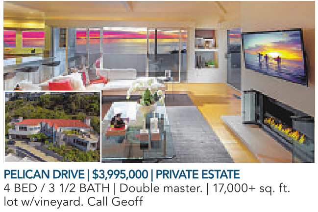 PELICANDRIVE|$3,995,000 |PRIVATEESTATE 4 BED / 3 1/2 BATH | Double master. | 17,000+ sq. ft. lot w/vineyard. Call Geoff