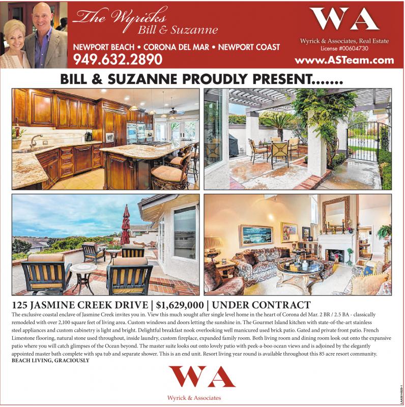 The Wyricks Bill & Suzanne NEWPORT BEACH • CORONA DEL MAR • NEWPORT COAST Wyrick & Associates, Real Estate License #00604730 949.632.2890 www.ASTeam.com BILL & SUZANNE PROUDLY PRESENT....... 125 JASMINE CREEK DRIVE | $1,629,000 | UNDER CONTRACT The exclusive coastal enclave of Jasmine Creek invites you in. View this much sought after single level home in the heart of Corona del Mar. 2 BR / 2.5 BA - classically remodeled with over 2,100 square feet of living area. Custom windows and doors letting the sunshine in. The Gourmet Island kitchen with state-of-the-art stainless steel appliances and custom cabinetry is light and bright. Delightful breakfast nook overlooking well manicured used brick patio. Gated and private front patio. French Limestone flooring, natural stone used throughout, inside laundry, custom fireplace, expanded family room. Both living room and dining room look out onto the expansive patio where you will catch glimpses of the Ocean beyond. The master suite looks out onto lovely patio with peek-a-boo ocean views and is adjoined by the elegantly appointed master bath complete with spa tub and separate shower. This is an end unit. Resort living year round is available throughout this 85 acre resort community. BEACH LIVING, GRACIOUSLY See also