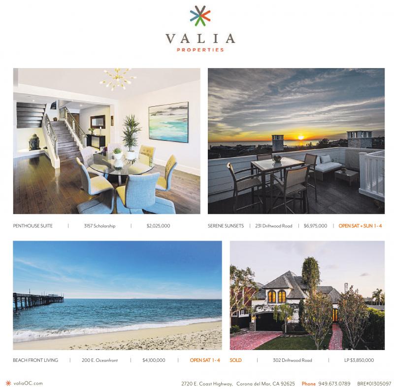 PENTHOUSE SUITE | 3157 Scholarship | $2,025,000 SERENE SUNSETS | 231 Driftwood Road | $6,975,000 | OPEN SAT+SUN 1-4 BEACH FRONT LIVING | 200 E. Oceanfront | $4,100,000 | OPEN SAT 1-4 SOLD | 302 Driftwood Road | LP $3,850,000 valiaOC.com 2720 E. Coast Highway, Corona del Mar, CA 92625 Phone 949.673.0789 BRE#01305097