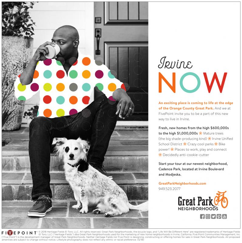 (“Five Point”) is the development manager of Great Park Neighborhoods. Neither Heritage Fields nor Five Point is designing, constructing or offering homes for sale in Great Park Neighborhoods. All proposed amenities are subject tochange without notice. Lifestyle photography does not reflect any ethnic or racial preference. (5/18)