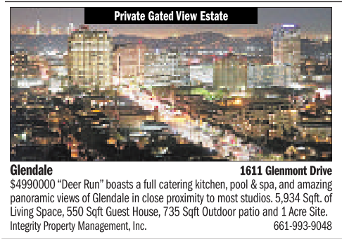 Glendale 1611 Glenmont Drive $4990000 “Deer Run” boasts afull catering kitchen, pool &spa, and amazing panoramic views of Glendale in close proximity to most studios. 5,934 Sqft. of Living Space, 550 Sqft Guest House, 735 Sqft Outdoor patio and 1Acre Site. IntegrityProperty Management, Inc. 661-993-9048