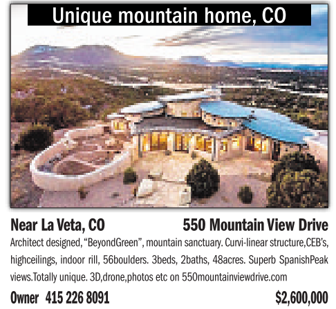 Architectdesigned,“BeyondGreen”, mountain sanctuary.Curvi-linearstructure,CEB’s, highceilings, indoor rill,56boulders.3beds, 2baths,48acres. Superb SpanishPeak views.Totally unique. 3D,drone,photos etc on 550mountainviewdrive.com