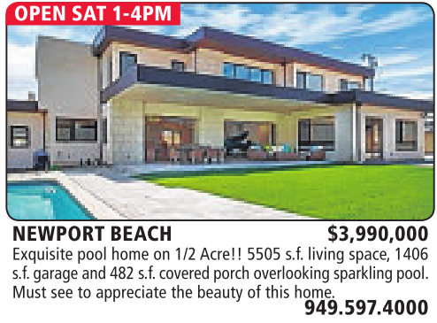 NEWPORT BEACH $3,990,000 Exquisite pool home on 1/2 Acre!! 5505 s.f. living space,1406 s.f. garage and 482 s.f. covered porchoverlooking sparklingpool. Must see to appreciate the beauty of this home. 949.597.4000