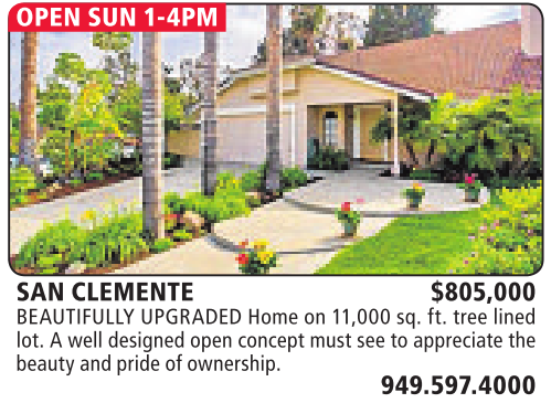 SAN CLEMENTE $805,000 BEAUTIFULLY UPGRADED Home on11,000 sq. ft. tree lined lot. Awell designed open concept must see toappreciate the beauty andpride of ownership.
