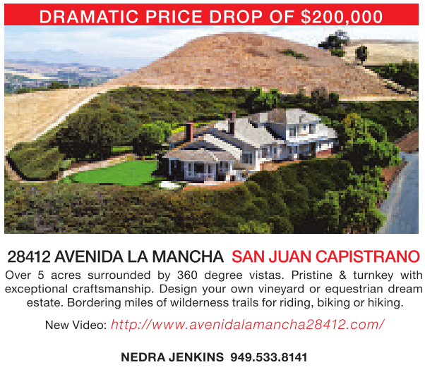 DRAMATIC PRICE DROP OF $200,000 28412AVENIDALAMANCHA SANJUANCAPISTRANO Over 5 acres surrounded by 360 degree vistas. Pristine & turnkey with exceptional craftsmanship. Design your own vineyard or equestrian dream estate. Bordering miles of wilderness trails for riding, biking or hiking. New Video: http://www.avenidalamancha28412.com/ NEDRA JENKINS 949.533.8141