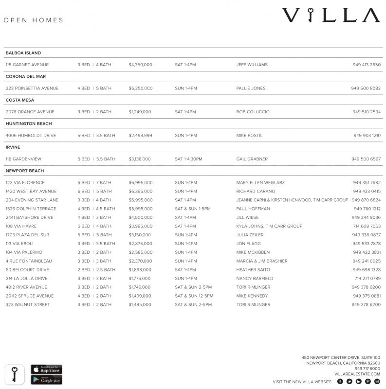 BALBOA ISLAND 115 GARNET AVENUE 3 BED | 4 BATH $4,350,000 SAT 1-4PM JEFF WILLIAMS 949 413 2550 CORONA DEL MAR 223 POINSETTIA AVENUE 4 BED | 5 BATH $5,250,000 SUN 1-4PM PALLIE JONES 949 500 8082 COSTA MESA 2076 ORANGE AVENUE 3 BED | 2 BATH $1,249,000 SAT 1-4PM BOB COLUCCIO 949 510 2594 HUNTINGTON BEACH 4006 HUMBOLDT DRIVE 5 BED | 3.5 BATH $2,499,999 SUN 1-4PM MIKE POSTIL 949 903 1210 IRVINE 118 GARDENVIEW 5 BED | 5.5 BATH $3,138,000 SAT 1-4:30PM GAIL GRABNER 949 500 6597 NEWPORT BEACH 123 VIA FLORENCE 5 BED | 7 BATH $6,995,000 SUN 1-4PM MARY ELLEN WEGLARZ 949 351 7582 1420 WEST BAY AVENUE 6 BED | 5 BATH $6,395,000 SUN 1-4PM RICHARD CARANO 949 433 0415 204 EVENING STAR LANE 3 BED | 4 BATH $5,995,000 SAT 1-4PM JEANNE CARNI & KIRSTEN HENWOOD, TIM CARR GROUP 949 870 6824 1536 DOLPHIN TERRACE 4 BED | 4.5 BATH $5,995,000 SAT & SUN 1-5PM PAUL HOFFMAN 949 760 1212 2441 BAYSHORE DRIVE 4 BED | 3 BATH $4,500,000 SAT 1-4PM JILL WIESE 949 244 9036 108 VIA HAVRE 5 BED | 4 BATH $3,995,000 SAT 1-4PM KYLA JOHNS, TIM CARR GROUP 714 609 7063 1703 PLAZA DEL SUR 5 BED | 5 BATH $3,150,000 SUN 1-4PM JULIA ZEILER 949 338 0837 113 VIA EBOLI 3 BED | 3.5 BATH $2,875,000 SUN 1-4PM JON FLAGG 949 533 7878 104 VIA PALERMO 3 BED | 2 BATH $2,585,000 SUN 1-4PM MIKE MCKIBBEN 949 422 3831 4 RUE FONTAINBLEAU 3 BED | 3 BATH $2,370,000 SUN 1-4PM MARCIA & JIM BRASHIER 949 241 6025 60 BELCOURT DRIVE 2 BED | 2.5 BATH $1,898,000 SAT 1-4PM HEATHER SAITO 949 698 1328 214 LA JOLLA DRIVE 3 BED | 3 BATH $1,775,000 SUN 1-4PM NANCY BARFIELD 714 271 0789 4812 RIVER AVENUE 3 BED | 2 BATH $1,749,000 SAT & SUN 2-5PM TORI RIMLINGER 949 378 6200 20112 SPRUCE AVENUE 4 BED | 2 BATH $1,499,000 SAT & SUN 12-5PM MIKE KENNEDY 949 375 0881 323 WALNUT STREET 3 BED | 2 BATH $1,495,000 SAT & SUN 2-5PM TORI RIMLINGER 949 378 6200