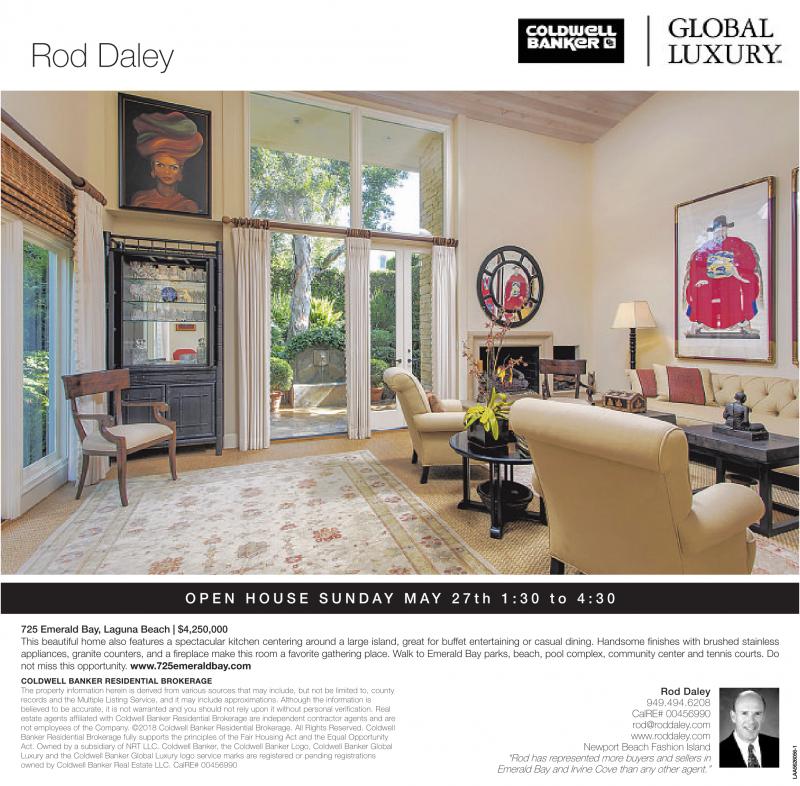 Rod Daley O P E N H O U S E S U N D A Y M A Y 2 7 t h 1 : 3 0 t o 4 : 3 0 725 Emerald Bay, Laguna Beach | $4,250,000 This beautiful home also features a spectacular kitchen centering around a large island, great for buffet entertaining or casual dining. Handsome finishes with brushed stainless appliances, granite counters, and a fireplace make this room a favorite gathering place. Walk to Emerald Bay parks, beach, pool complex, community center and tennis courts. Do not miss this opportunity. www.725emeraldbay.com COLDWELL BANKER RESIDENTIAL BROKERAGE The property information herein is derived from various sources that may include, but not be limited to, county records and the Multiple Listing Service, and it may include approximations. Although the information is believed to be accurate, it is not warranted and you should not rely upon it without personal verification. Real estate agents affiliated with Coldwell Banker Residential Brokerage are independent contractor agents and are not employees of the Company. ©2018 Coldwell Banker Residential Brokerage. All Rights Reserved. Coldwell Banker Residential Brokerage fully supports the principles of the Fair Housing Act and the Equal Opportunity Act. Owned by a subsidiary of NRT LLC. Coldwell Banker, the Coldwell Banker Logo, Coldwell Banker Global Luxury and the Coldwell Banker Global Luxury logo service marks are registered or pending registrations owned by Coldwell Banker Real Estate LLC. CalRE# 00456990 Rod Daley 949.494.6208 CalRE# 00456990 rod@roddaley.com www.roddaley.com Newport Beach Fashion Island “Rod has represented more buyers and sellers in Emerald Bay and Irvine Cove than any other agent.”