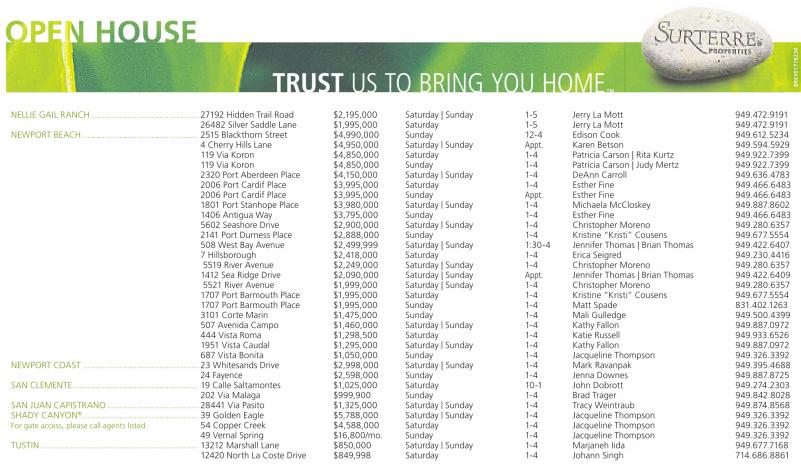 NELLIE GAIL RANCH............................................ 27192 Hidden Trail Road $2,195,000 Saturday | Sunday 1-5 Jerry La Mott 949.472.9191 26482 Silver Saddle Lane $1,995,000 Saturday 1-5 Jerry La Mott 949.472.9191 NEWPORT BEACH ............................................... 2515 Blackthorn Street $4,990,000 Sunday 12-4 Edison Cook 949.612.5234 4 Cherry Hills Lane $4,950,000 Saturday | Sunday Appt. Karen Betson 949.594.5929 119 Via Koron $4,850,000 Saturday 1-4 Patricia Carson | Rita Kurtz 949.922.7399 119 Via Koron $4,850,000 Sunday 1-4 Patricia Carson | Judy Mertz 949.922.7399 2320 Port Aberdeen Place $4,150,000 Saturday | Sunday 1-4 DeAnn Carroll 949.636.4783 2006 Port Cardif Place $3,995,000 Saturday 1-4 Esther Fine 949.466.6483 2006 Port Cardif Place $3,995,000 Sunday Appt. Esther Fine 949.466.6483 1801 Port Stanhope Place $3,980,000 Saturday | Sunday 1-4 Michaela McCloskey 949.887.8602 1406 Antigua Way $3,795,000 Sunday 1-4 Esther Fine 949.466.6483 5602 Seashore Drive $2,900,000 Saturday | Sunday 1-4 Christopher Moreno 949.280.6357 2141 Port Durness Place $2,888,000 Sunday 1-4 Kristine “Kristi” Cousens 949.677.5554 508 West Bay Avenue $2,499,999 Saturday | Sunday 1:30-4 Jennifer Thomas | Brian Thomas 949.422.6407 7 Hillsborough $2,418,000 Saturday 1-4 Erica Seigred 949.230.4416 5519 River Avenue $2,249,000 Saturday | Sunday 1-4 Christopher Moreno 949.280.6357 1412 Sea Ridge Drive $2,090,000 Saturday | Sunday Appt. Jennifer Thomas | Brian Thomas 949.422.6409 5521 River Avenue $1,999,000 Saturday | Sunday 1-4 Christopher Moreno 949.280.6357 1707 Port Barmouth Place $1,995,000 Saturday 1-4 Kristine “Kristi” Cousens 949.677.5554 1707 Port Barmouth Place $1,995,000 Sunday 1-4 Matt Spade 831.402.1263 3101 Corte Marin $1,475,000 Sunday 1-4 Mali Gulledge 949.500.4399 507 Avenida Campo $1,460,000 Saturday | Sunday 1-4 Kathy Fallon 949.887.0972 444 Vista Roma $1,298,500 Saturday 1-4 Katie Russell 949.933.6526 1951 Vista Caudal $1,295,000 Saturday | Sunday 1-4 Kathy Fallon 949.887.0972 687 Vista Bonita $1,050,000 Sunday 1-4 Jacqueline Thompson 949.326.3392 NEWPORT COAST ............................................... 23 Whitesands Drive $2,998,000 Saturday | Sunday 1-4 Mark Ravanpak 949.395.4688 24 Fayence $2,598,000 Sunday 1-4 Jenna Downes 949.887.8725 SAN CLEMENTE................................................... 19 Calle Saltamontes $1,025,000 Saturday 10-1 John Dobrott 949.274.2303 202 Via Malaga $999,900 Sunday 1-4 Brad Trager 949.842.8028 SAN JUAN CAPISTRANO ..................................... 28441 Via Pasito $1,325,000 Saturday | Sunday 1-4 Tracy Weintraub 949.874.8568 SHADY CANYON ® ............................................... 39 Golden Eagle $5,788,000 Saturday | Sunday 1-4 Jacqueline Thompson 949.326.3392 For gate access, please call agents listed. 54 Copper Creek $4,588,000 Saturday 1-4 Jacqueline Thompson 949.326.3392 49 Vernal Spring $16,800/mo. Sunday 1-4 Jacqueline Thompson 949.326.3392 TUSTIN................................................................ 13212 Marshall Lane $850,000 Saturday | Sunday 1-4 Marjaneh Iida 949.677.7168 12420 North La Coste Drive $849,998 Saturday 1-4 Johann Singh 714.686.8861