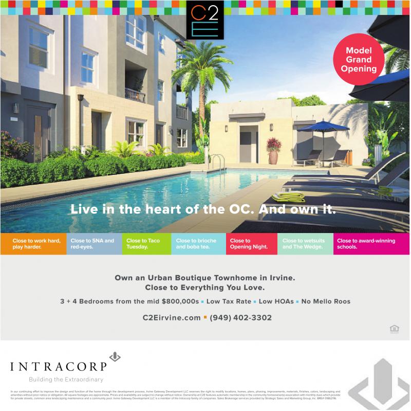 Model Grand Opening Live in the heart of the OC. And own it. Close to work hard, play harder. Close to SNA and red-eyes. Close to Taco Tuesday. Close to brioche and boba tea. Close to Opening Night. Close to wetsuits and The Wedge. Close to award-winning schools. Own an Urban Boutique Townhome in Irvine. Close to Everything You Love. 3 + 4 Bedrooms from the mid $800,000s Low Tax Rate Low HOAs No Mello Roos C2Eirvine.com (949) 402-3302 In our continuing effort to improve the design and function of the home through the development process, Irvine Gateway Development LLC reserves the right to modify locations, homes, plans, phasing, improvements, materials, finishes, colors, landscaping and amenities without prior notice or obligation. All square footages are approximate.Prices and availability are subject to change without notice.Ownership at C2E features automatic membership in the community homeowner(s) association with monthly dues which provide for private streets, common area landscaping maintenance and acommunity pool. Irvine Gateway Development LLC isamember ofthe Intracorp family of companies. Sales Brokerage services provided by Strategic Sales and Marketing Group, Inc. BRE# 01862116.