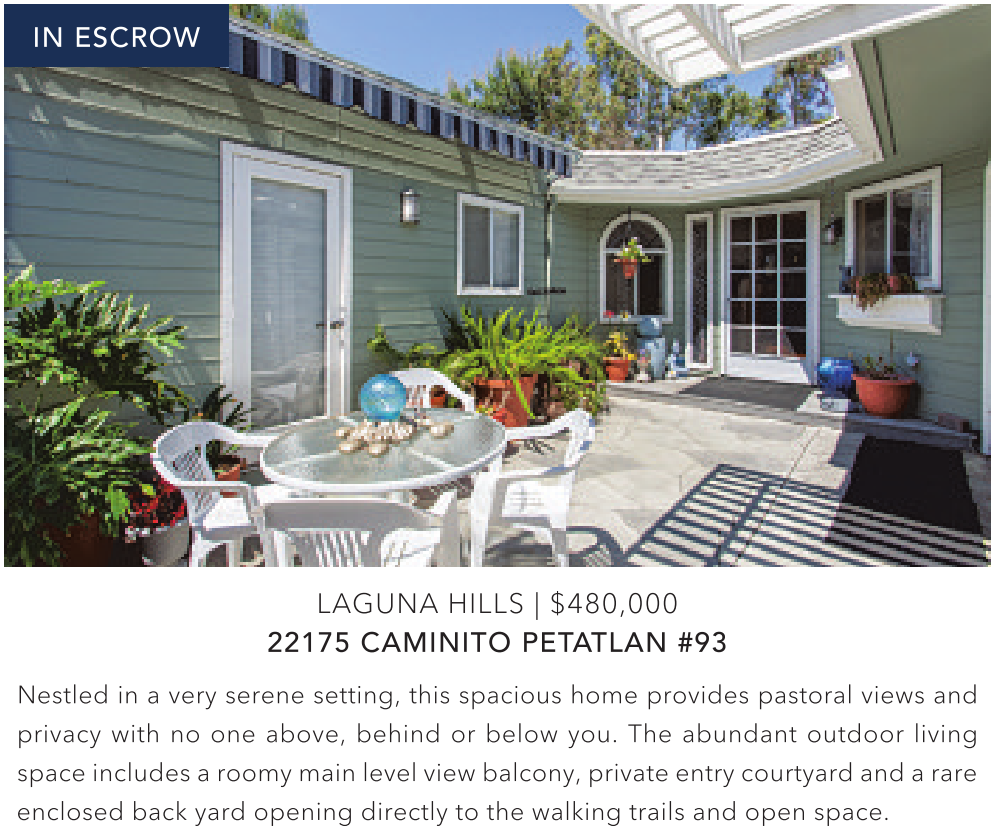 IN ESCROW LAGUNA HILLS | $480,000 22175 CAMINITO PETATLAN #93 Nestled in a very serene setting, this spacious home provides pastoral views and privacy with no one above, behind or below you. The abundant outdoor living space includes a roomy main level view balcony, private entry courtyard and a rare enclosed back yard opening directly to the walking trails and open space.