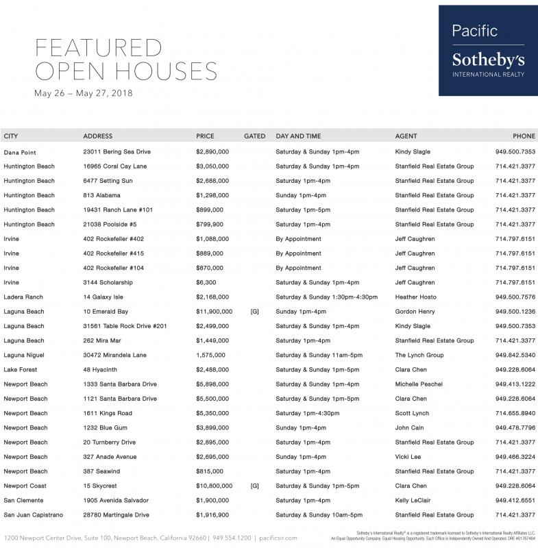 Irvine 402 Rockefeller #415 $889,000 By Appointment Jeff Caughren 714.797.6151 Irvine 402 Rockefeller #104 $870,000 By Appointment Jeff Caughren 714.797.6151 Irvine 3144 Scholarship $6,300 Saturday & Sunday 1pm-4pm Jeff Caughren 714.797.6151 Ladera Ranch 14 Galaxy Isle $2,168,000 Saturday & Sunday 1:30pm-4:30pm Heather Hosto 949.500.7576 Laguna Beach 10 Emerald Bay $11,900,000 [G] Sunday 1pm-4pm Gordon Henry 949.500.1236 Laguna Beach 31561 Table Rock Drive #201 $2,499,000 Saturday & Sunday 1pm-4pm Kindy Slagle 949.500.7353 Laguna Beach 262 Mira Mar $1,449,000 Saturday 1pm-4pm Stanfield Real Estate Group 714.421.3377 Laguna Niguel 30472 Mirandela Lane 1,575,000 Saturday & Sunday 11am-5pm The Lynch Group 949.842.5340 Lake Forest 48 Hyacinth $2,488,000 Saturday & Sunday 1pm-5pm Clara Chen 949.228.6064 Newport Beach 1333 Santa Barbara Drive $5,898,000 Saturday & Sunday 1pm-4pm Michelle Peschel 949.413.1222 Newport Beach 1121 Santa Barbara Drive $5,500,000 Saturday & Sunday 1pm-5pm Clara Chen 949.228.6064 Newport Beach 1611 Kings Road $5,350,000 Saturday 1pm-4:30pm Scott Lynch 714.655.8940 Newport Beach 1232 Blue Gum $3,899,000 Sunday 1pm-4pm John Cain 949.478.7796 Newport Beach 20 Turnberry Drive $2,895,000 Saturday 1pm-4pm Stanfield Real Estate Group 714.421.3377 Newport Beach 327 Anade Avenue $2,695,000 Sunday 1pm-4pm Vicki Lee 949.466.3224 Newport Beach 387 Seawind $815,000 Saturday 1pm-4pm Stanfield Real Estate Group 714.421.3377 Newport Coast 15 Skycrest $10,800,000 [G] Saturday & Sunday 1pm-5pm Clara Chen 949.228.6064 San Clemente 1905 Avenida Salvador $1,900,000 Saturday 1pm-4pm Kelly LeClair 949.412.6551 San Juan Capistrano 28780 Martingale Drive $1,916,900 Saturday & Sunday 10am-5pm Stanfield Real Estate Group 714.421.3377