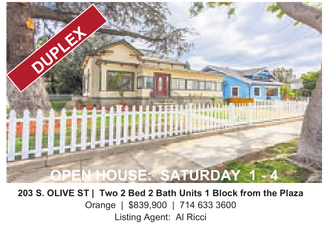 203 S.OLIVE ST | Two 2Bed 2Bath Units 1Block from the Plaza Orange | $839,900 | 714 633 3600 Listing Agent: AlRicci