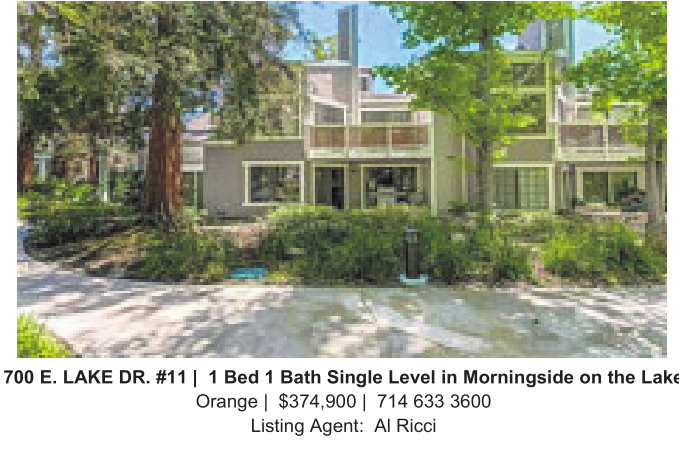 700 E. LAKE DR. #11 | 1Bed 1Bath Single Level in Morningside on the Lake Orange | $374,900 | 714 633 3600 Listing Agent: Al Ricci