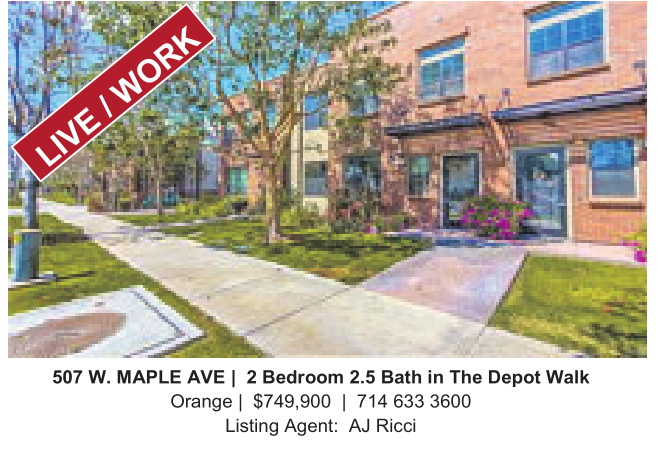 507 W. MAPLE AVE | 2 Bedroom 2.5 Bath inThe Depot Walk Orange | $749,900 | 714 633 3600 Listing Agent: AJRicci
