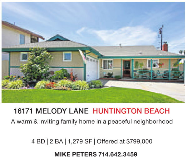 16171 MELODY LANE HUNTINGTON BEACH Awarm &inviting family home inapeaceful neighborhood 4BD|2BA|1,279 SF |Offered at $799,000 MIKE PETERS 714.642.3459