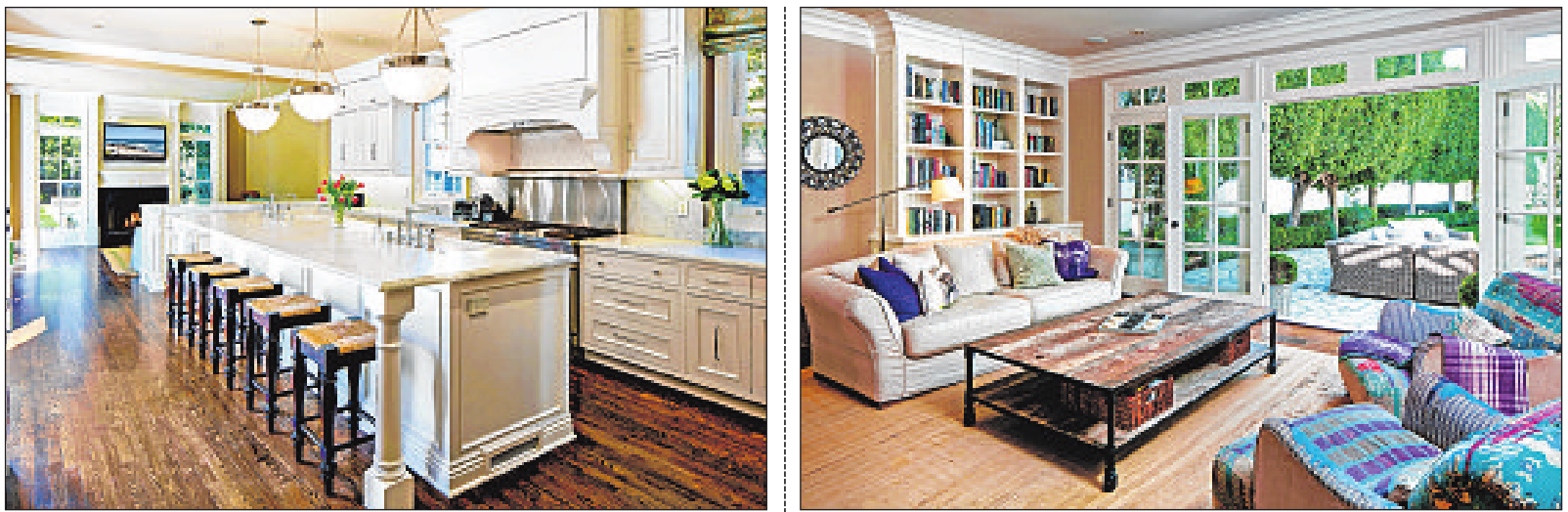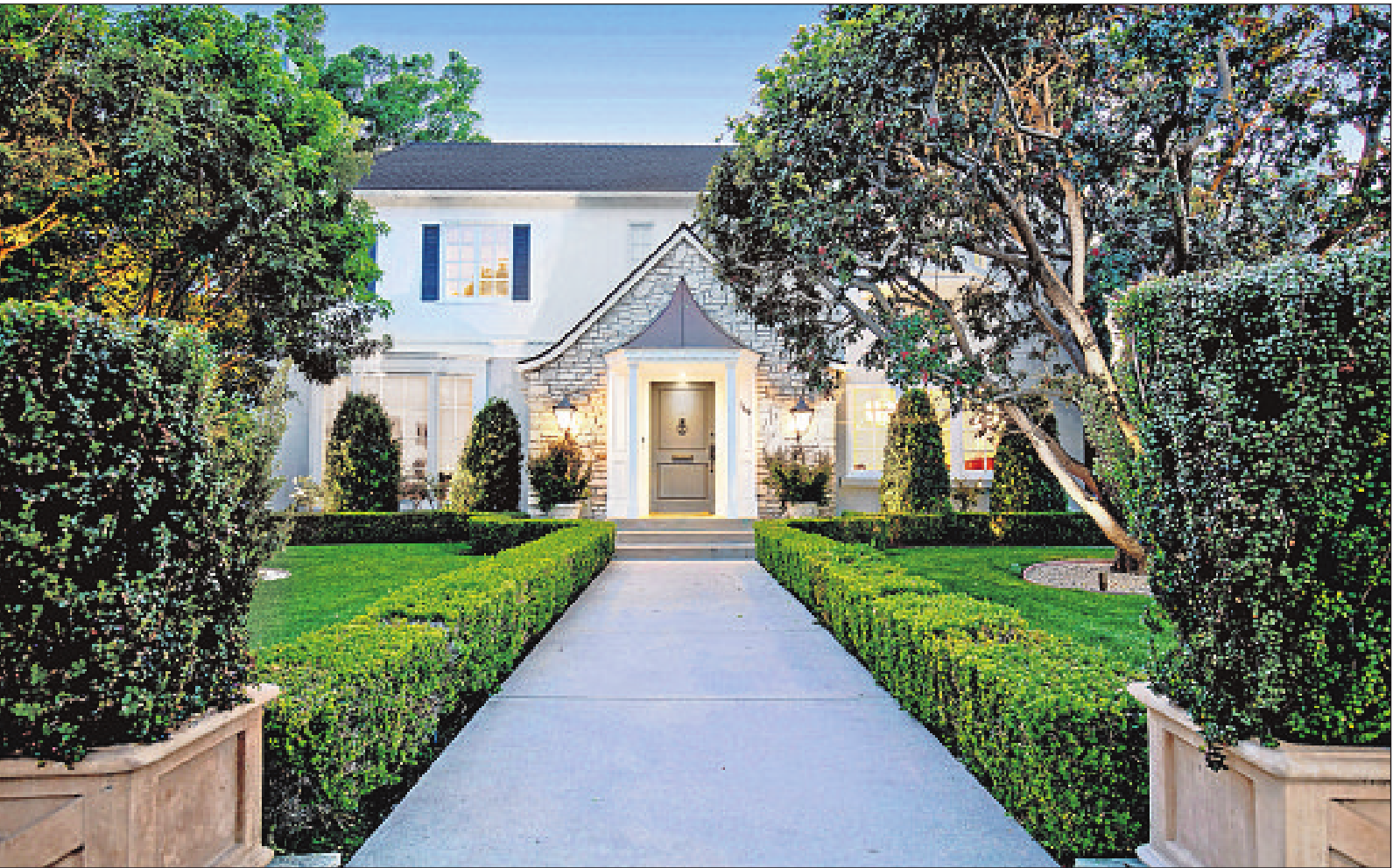 The house sits on a quarteracre lot that includes a guesthouse and a stone-rimmed swimming pool. Turf lawns, hedges and various patios complete the grounds.