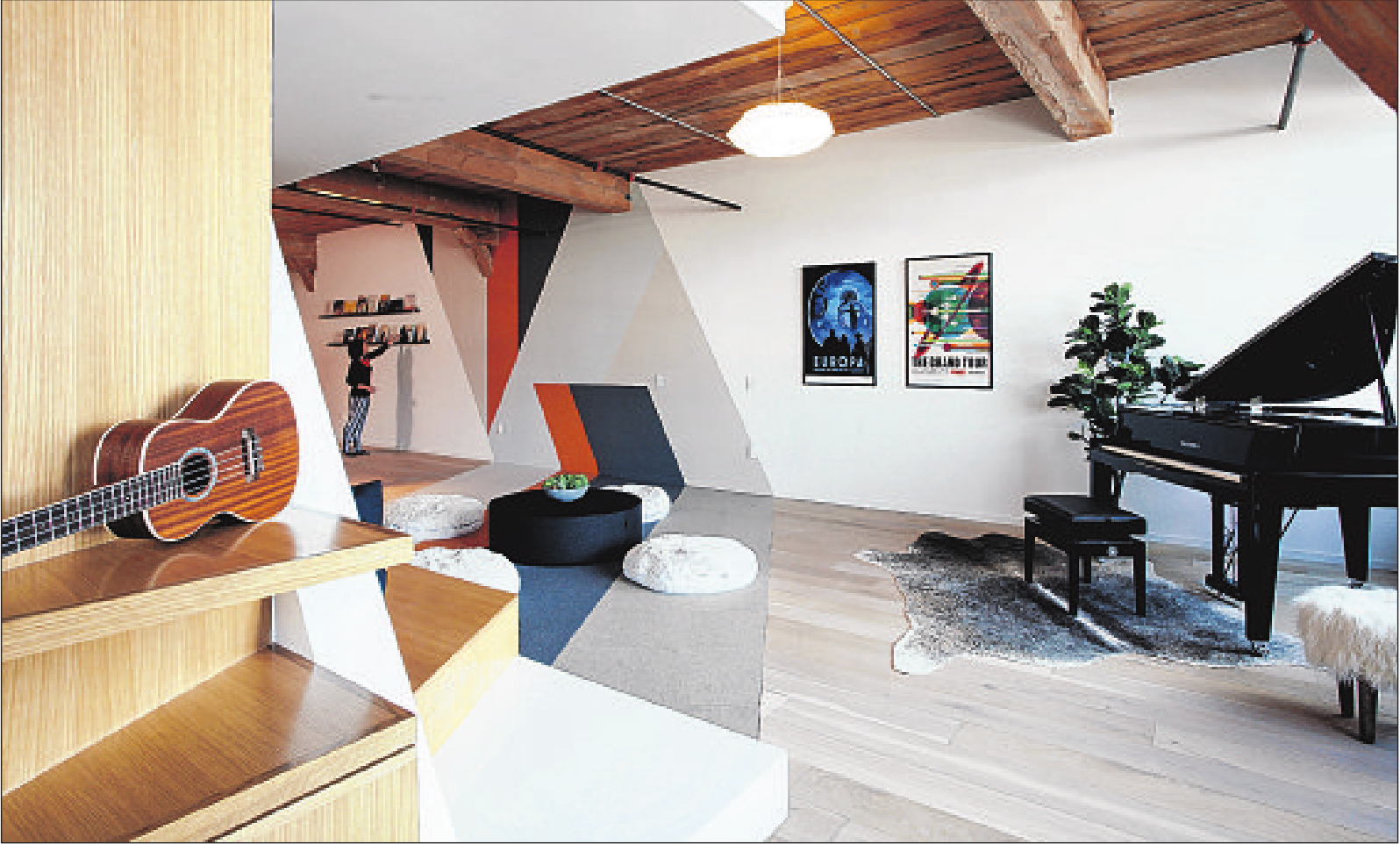 The combined space was woven together by two sleek extralarge furniture pieces designed by the firm. It delineated the loft’s separate areas and also provided attractive shelving and storage.