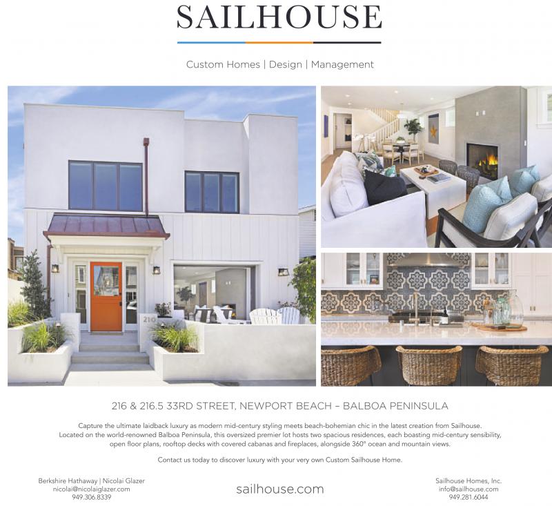 Custom Homes | Design | Management 216 & 216.5 33RD STREET, NEWPORT BEACH – BALBOA PENINSULA Capture the ultimate laidback luxury as modern mid-century styling meets beach-bohemian chic in the latest creation from Sailhouse. Located on the world-renowned Balboa Peninsula, this oversized premier lot hosts two spacious residences, each boasting mid-century sensibility, open floor plans, rooftop decks with covered cabanas and fireplaces, alongside 360° ocean and mountain views. Contact us today to discover luxury with your very own Custom Sailhouse Home. Berkshire Hathaway | Nicolai Glazer nicolai@nicolaiglazer.com 949.306.8339 sailhouse.com Sailhouse Homes, Inc. info@sailhouse.com 949.281.6044
