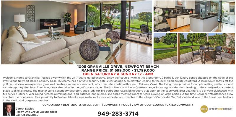 1005 GRANVILLE DRIVE, NEWPORT BEACH RANGE PRICE: $1,699,000 - $1,799,000 OPEN SATURDAY & SUNDAY 12 - 4PM Welcome, Home to Granville. Tucked away within the 24-7 guard-gated enclave. Enjoy golf course living in this 3 bedroom, 2 baths & den luxury condo situated on the edge of the Prestigious Newport Beach Country Club. This home has a private security gate, 2 car garage & an elevator leading to the over-sized private courtyard. A large foyer shows off the golf course view. An expansive glass wall creates a serene environment, which leads to a patio with superb Fairway Views. The living room provides for ample seating nestled around a contemporary fireplace. The dining area also takes in the golf course vistas. The kitchen island has a Cooktop range & seating; a slider door leading to the courtyard is a perfect place to dine al fresco. The master suite, secondary bedroom, and study (or 3rd bedroom) have sliding doors that open to the courtyard. Best yet, there is a private clubhouse with full-service kitchen, year-round heated swimming pool and outdoor lounge area, spa and a meeting room for card playing or large parties. A full-time Gardener/Maintenance crew maintain the front areas. Plus, proximity to Fashion Island shops, restaurants, movie theater and minutes to the village of Corona del Mar, Balboa Island, one of the finest boat harbors in the world and gorgeous beaches. CONDO: 2BD + DEN | 2BA | 2,168 EST. SQ.FT. | COMMUNITY POOL | VIEW OF GOLF COURSE | GATED COMMUNITY Gareth Davies Realty One Group Laguna Nigel CalRE# 01251065 949-283-3714