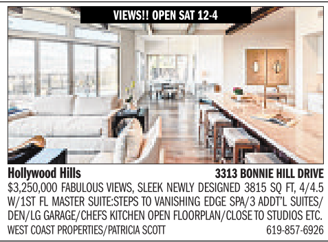 VIEWS!! OPEN SAT12-4 Hollywood Hills 3313 BONNIE HILL DRIVE $3,250,000 FABULOUS VIEWS, SLEEK NEWLY DESIGNED 3815 SQ FT,4/4.5 W/1ST FLMASTER SUITE:STEPS TO VANISHING EDGE SPA/3 ADDT’L SUITES/ DEN/LG GARAGE/CHEFS KITCHEN OPEN FLOORPLAN/CLOSE TO STUDIOS ETC. WESTCOAST PROPERTIES/PATRICIASCOTT 619-857-6926