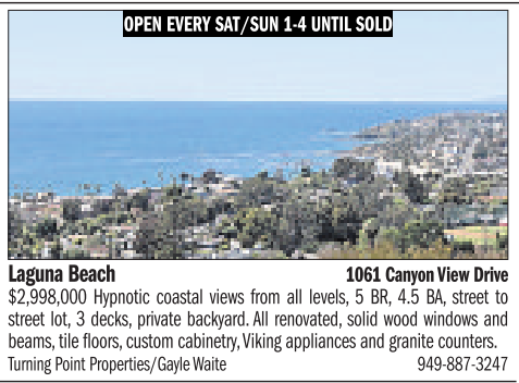 Laguna Beach 1061Canyon View Drive $2,998,000 Hypnotic coastal views from all levels, 5 BR, 4.5 BA, street to street lot, 3decks,private backyard. All renovated, solid wood windows and beams,tile floors, custom cabinetry,Vikingappliances and granitecounters. TurningPointProperties/GayleWaite 949-887-3247