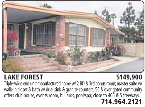 LAKE FOREST $149,900 Triple-wide end unit manufactured home w/ 2BD&3rd bonusroom; master suite w/ walk-in closet &bath w/ dual sink &granite counters; 55 &over gatedcommunity offers club house,events room, billiards,pool/spa; close to 405 &5freeways.