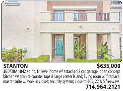 STANTON $635,000 3BD/3BA 1842 sq.ft. Trilevel home w/ attached2cargarage; openconcept kitchen w/ granitecountertops &large centerisland; living room w/ fireplace; master suite w/ walkincloset; securitysystem; close to 405, 22 &5freeways.