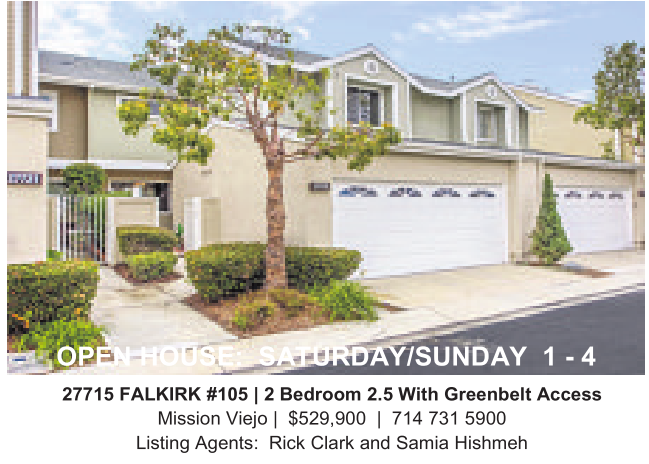 27715 FALKIRK #105 |2Bedroom 2.5 With Greenbelt Access Mission Viejo | $529,900 | 714 731 5900 Listing Agents: Rick Clark and Samia Hishmeh